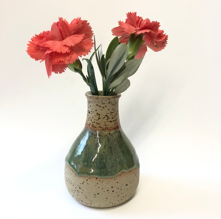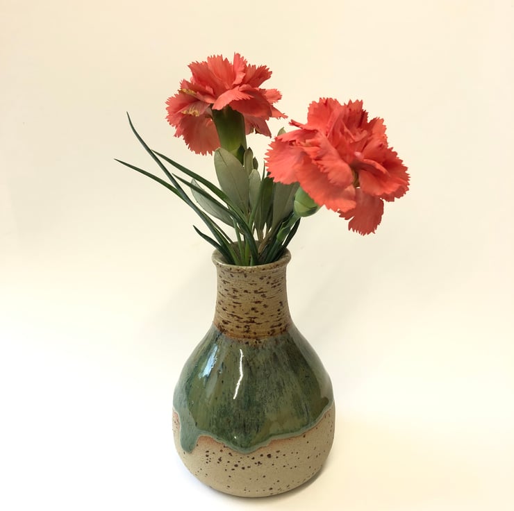 Made from speckled buff clay, it measures 10cm tall and 7cm at the base. It has been glazed inside with a clear shiny glaze and outside with a lovely green dripping glaze that has lovely effects where the glaze has interacted with the iron in the clay. I've left some of the vase unglazed to enjoy the speckles!