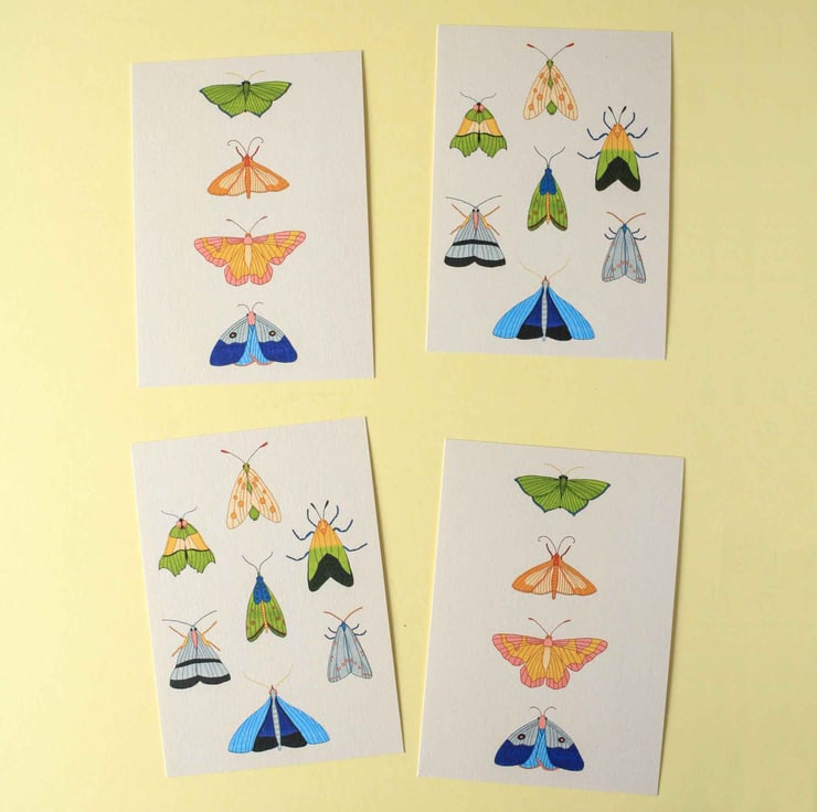Set of 4 postcards featuring illustrations of colourful moths in shades of pink, yellow, green and blue - 2 of each design. Use them as mini art prints to decorate your home or workspace, or send them to friends and family. Designed and printed in the UK.