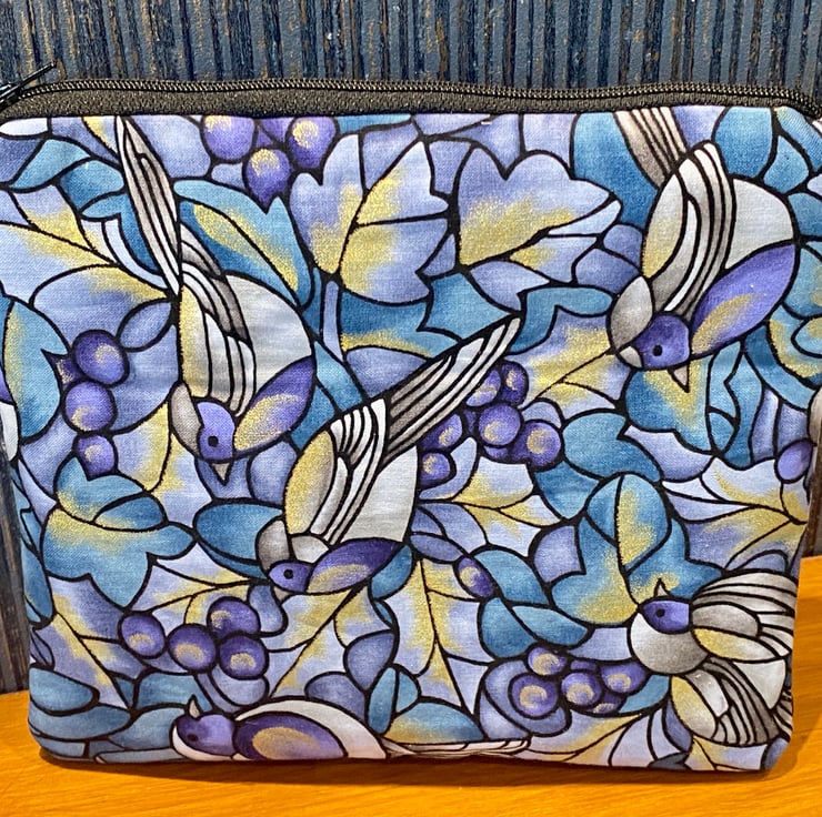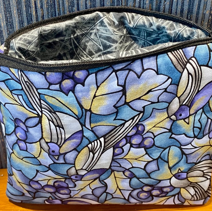 This is a lovely ladies travel toiletry or make-up bag featuring cotton fabric with blue birds and berries on a blue and gold background. The inner fabric is a grey patterned cotton fabric.