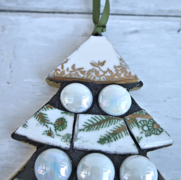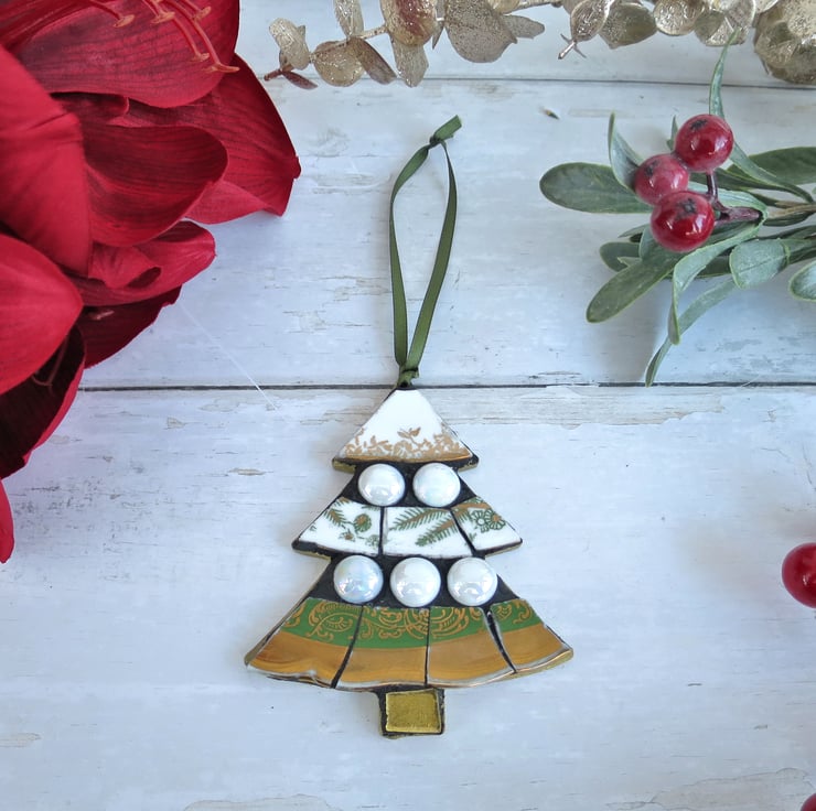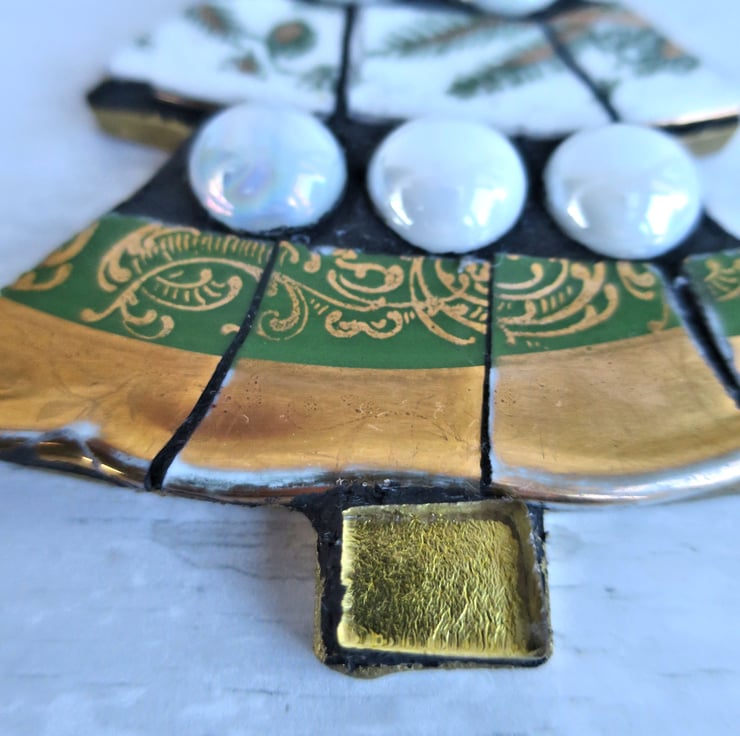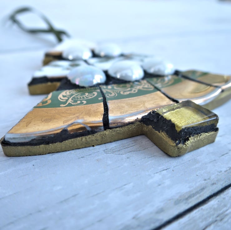 Add a festive touch to your holiday decor with this handcrafted Christmas tree-shaped mosaic. Handmade with care, it is made from recycled vintage plates, glass mosaic tiles, and glass beads. Perfect as a unique Christmas ornament, a thoughtful holiday gift, or an original piece of festive wall art, this mosaic is a beautiful way to celebrate the season.