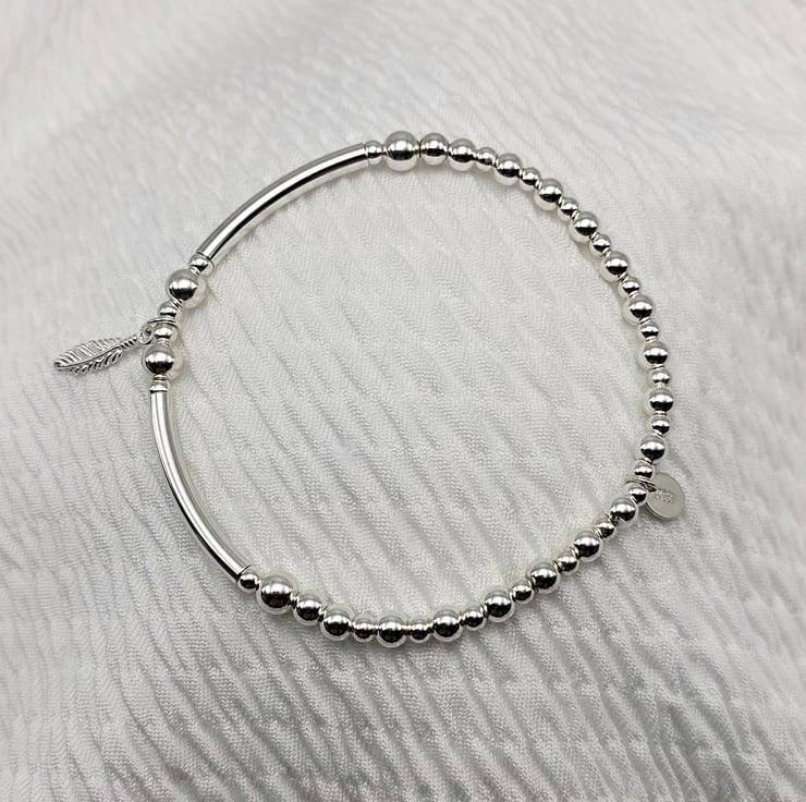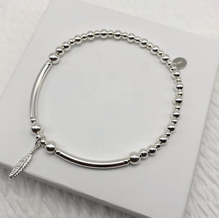This exquisite bracelet has been hand threaded on high quality jewellery elastic. It will comfortable fit up to a 19cm/7.5" wrist. Made with a mix of 3, 4 and 5mm sterling silver round beads the delicate feather charm hangs between 2 sterling silver tube beads which form a bracelet shape on the wrist. A small oval 925 stamped tag is included.