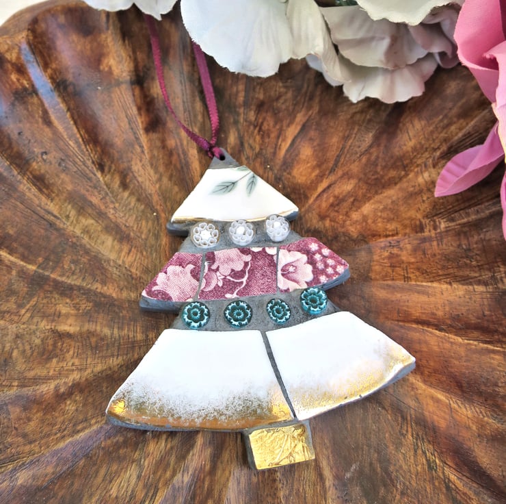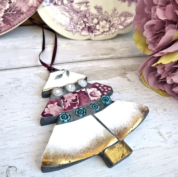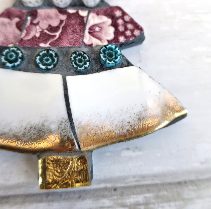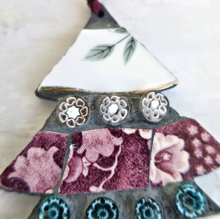 Mosaic Tree Ornament, Handmade Decoration with Vintage China and Glass Detail