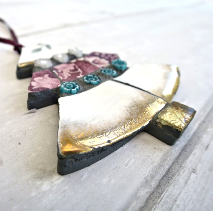 This handcrafted mosaic tree ornament is made using a mix of vintage china, millefiori glass, and shimmering tiles in shades of purple, teal, white and gold. Full of character and quiet sparkle, each piece is individually shaped and placed, creating a one-of-a-kind keepsake with gentle rustic charm.