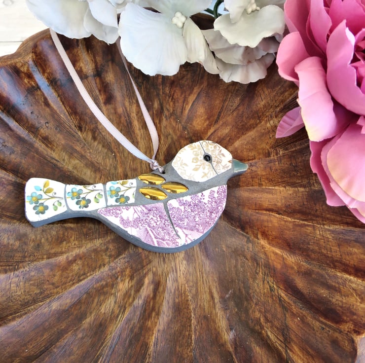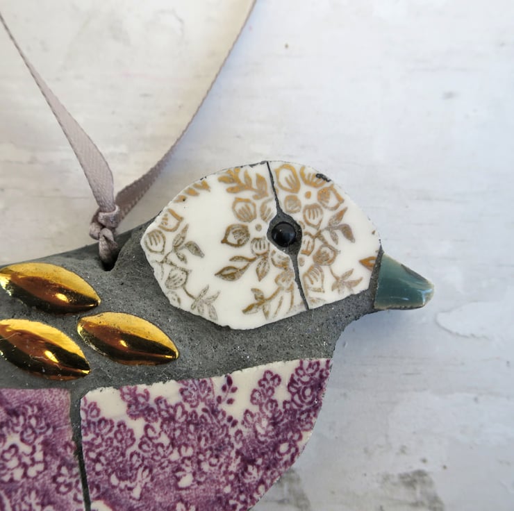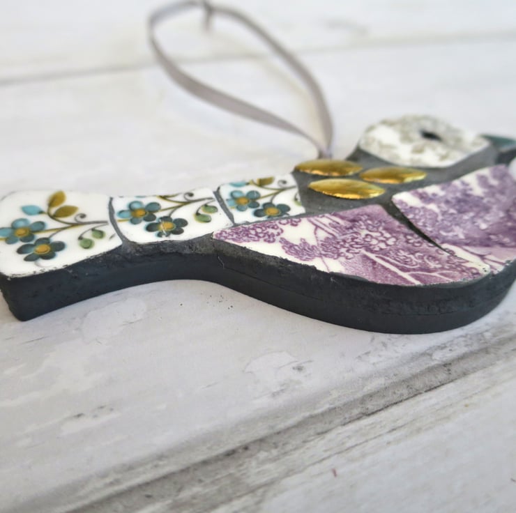 Handcrafted mosaic wall art piece in a rustic bird design, made from recycled vintage plates in shades of purple, white, gold and blue. This unique ornament would make a thoughtful Christmas, birthday, wedding or housewarming gift option, or it can be part of your room decor as an original piece of art.