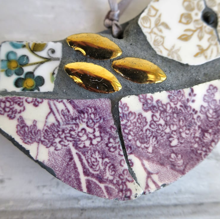 These decorations are suitable for indoors and care must be taken as they may have sharp edges due to the materials used. As the materials used include vintage ceramics, there may be signs of use and wear, further adding to the rustic appeal of the artwork.