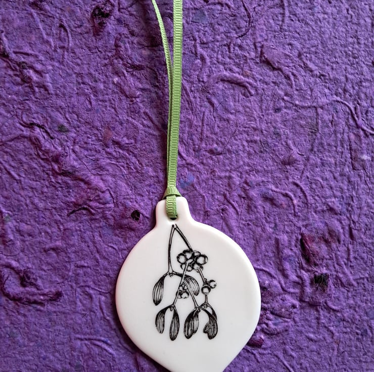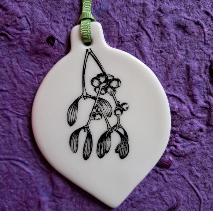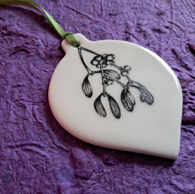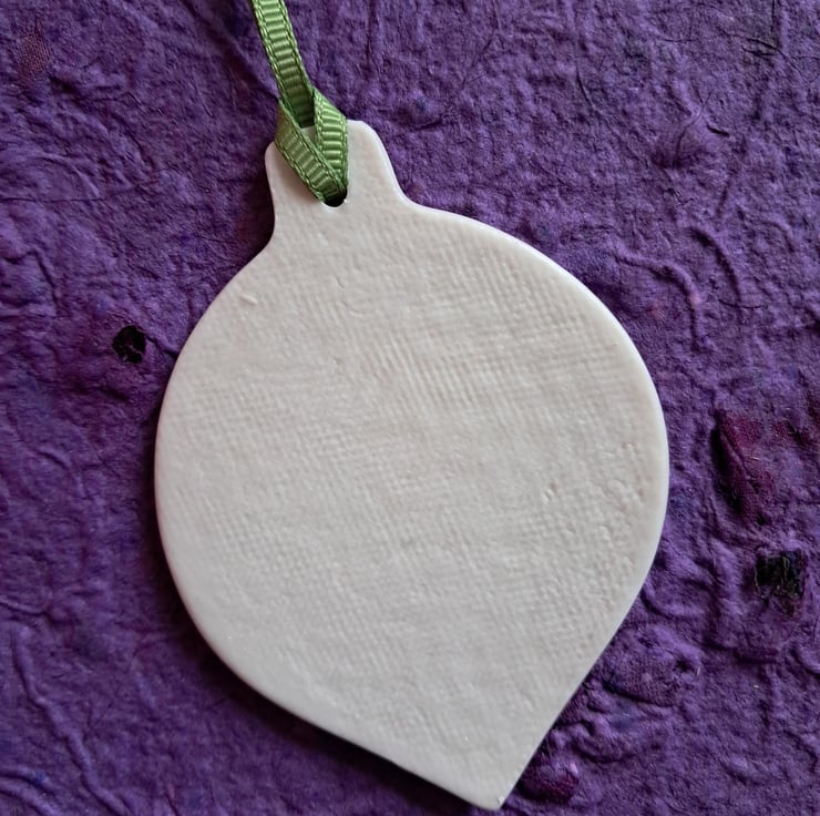 Made from a rolled sheet of porcelain clay, the bauble shape is made using a cutter. It then goes through three firing processes over several weeks. The transfer is fired on at 800 degrees centigrade. The dimensions are approximately 8cm tall and 6cm wide at the widest points. They are 4mm thick and not glazed on the reverse. Please note the sizes may vary slightly as they are all individually hand made. The 3mm wide ribbon is 25cm long in total so each strand measures about 14cm. The image is from a Victorian source and made especially for me.