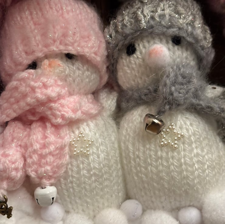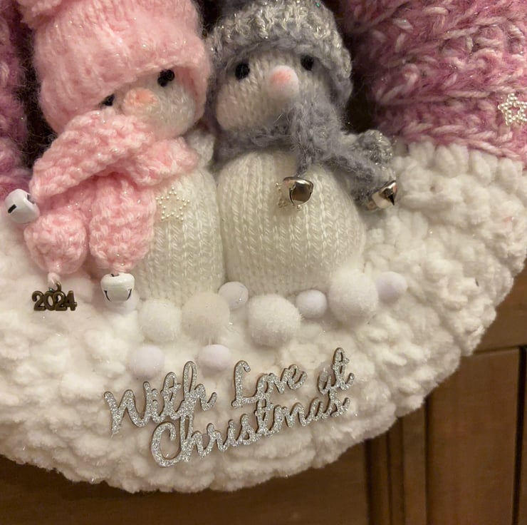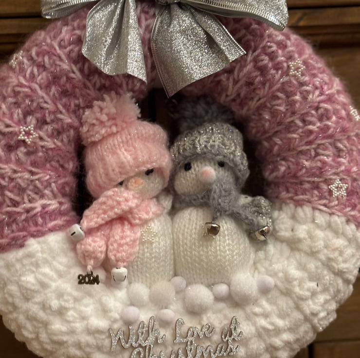 Lovely wreath with snuggly little snowmen pink and white with accents of silver and grey