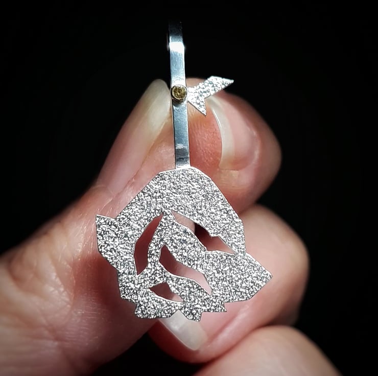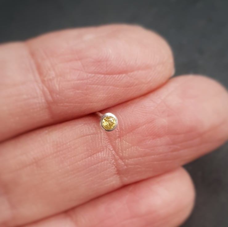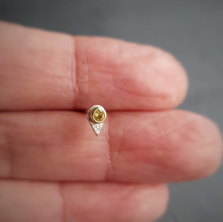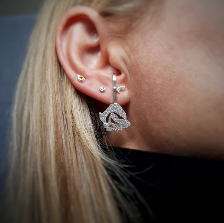 This is such a unique set of earrings, a truly one of a kind piece consisting of three earrings: two little studs handmade in Argentium sterling silver, 18 carat gold and set with round yellow sapphires. And a rose cuff-style earring, also handmade in Argentium sterling silver, 18 carat gold and set with a yellow sapphire. The rose cuff is secured in place with a normal ear wire (like a stud) although it looks like it is supported only by the curled stem at the top.