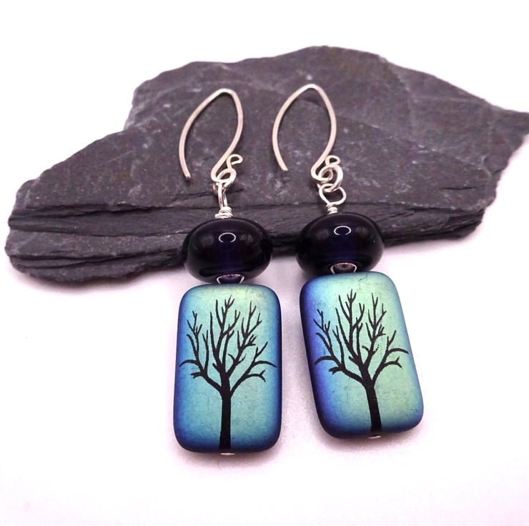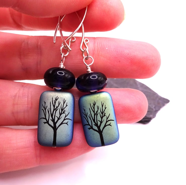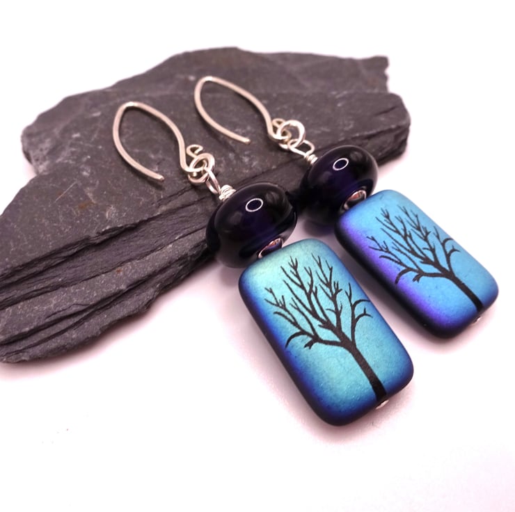 A pair of earrings made with handmade sterling silver ear wires, handmade lampwork purple glass beads and Czech glass tree beads.