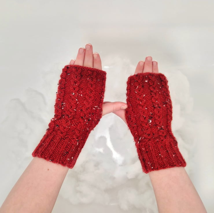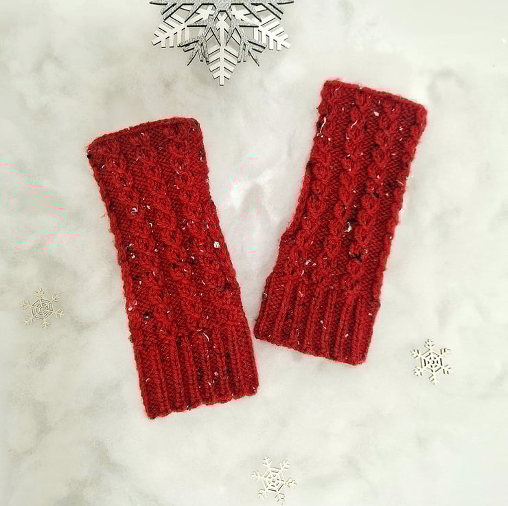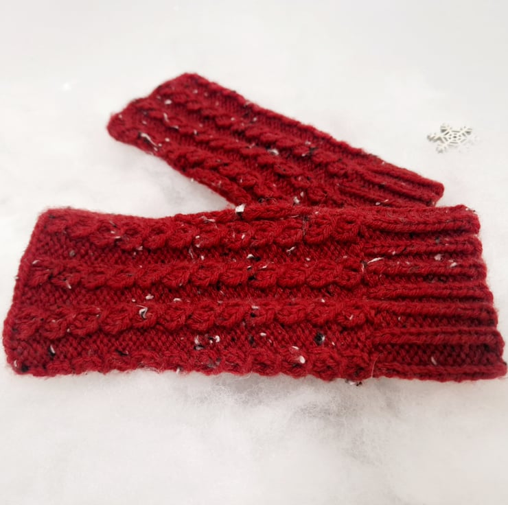 Brave the chill in style with our festive, dark red, cable knit fingerless gloves. Made using a quality, tweed effect acrylic yarn, these striking hand knit gloves feature a pretty mock cable pattern around the entire circumference of the glove, enhanced by flashes of white. The pattern also adds thickness, making these aran knit fingerless gloves extremely cosy.