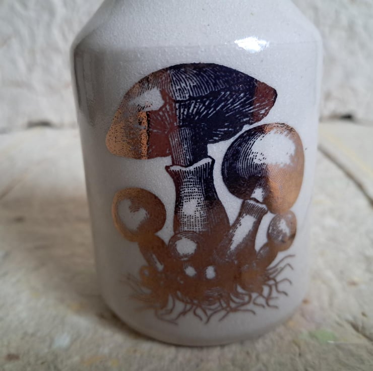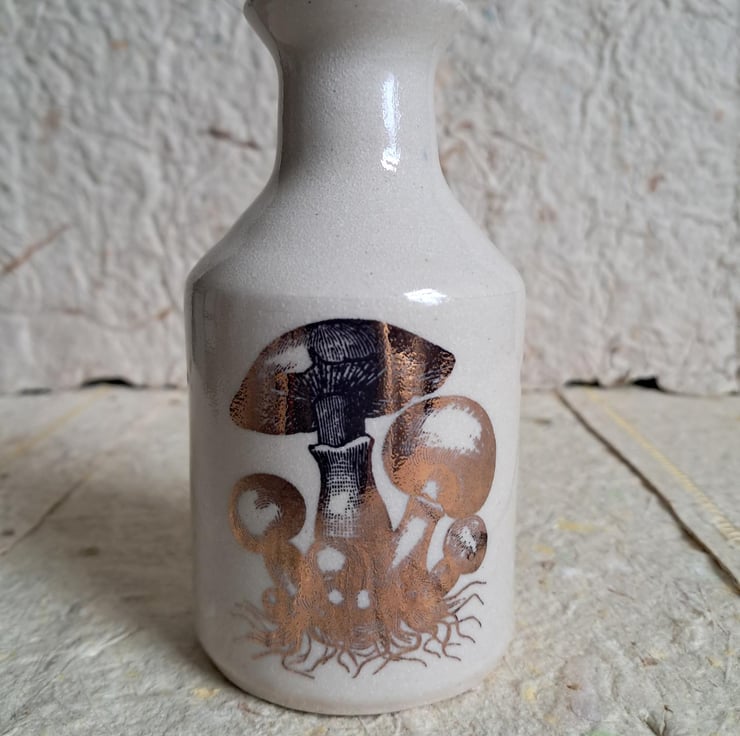 I love throwing bottle shapes on the potter's wheel and decorating them with these gorgeous copper toadstool transfers.