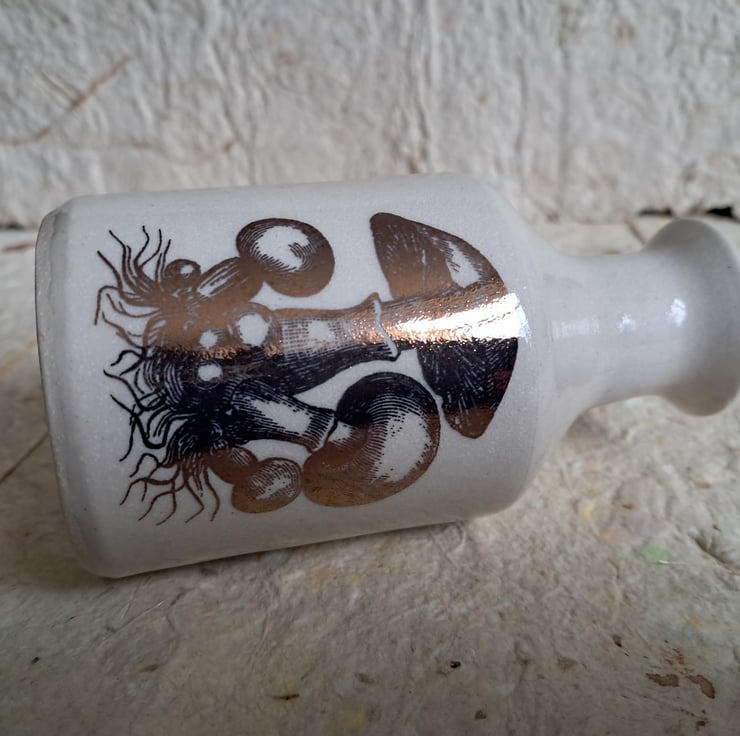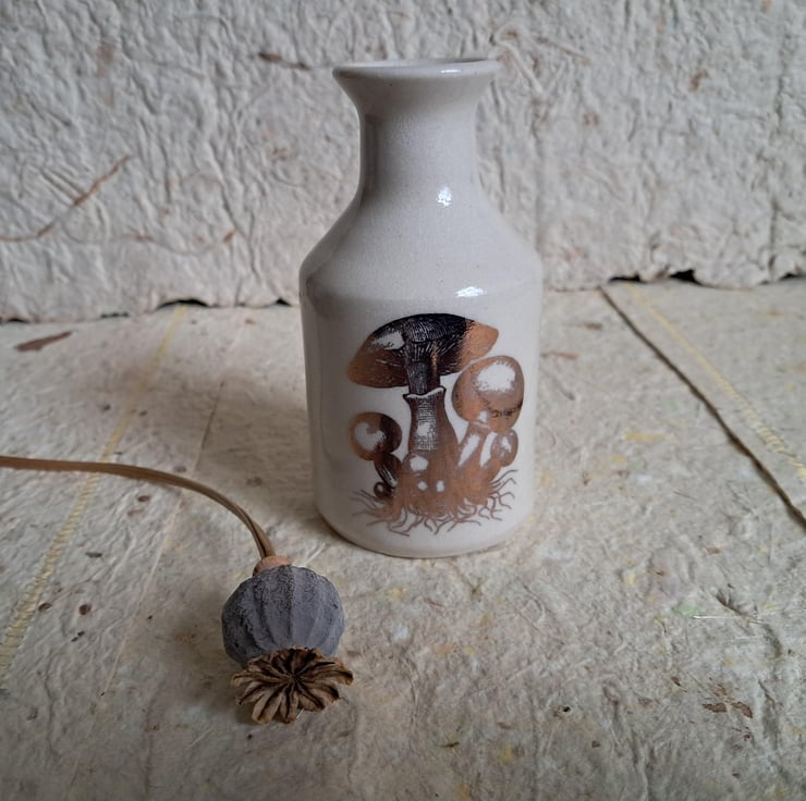 A small stoneware bud vase with a copper toadstool image on the surface. Hand thrown on the potter's wheel using 250g of clay, then glazed inside and outside but not on the base. Stoneware clay is fired at very high temperatures and the clay is fully vitrified with the glaze making it completely watertight. The toadstool is an overglaze transfer and is permanent being fired on at 800 degrees Centigrade. Each bud vase measures approximately 10.5cm high, 5.5cm diameter at the base and 1.5cm opening at the top. There may be small variations being individually made. The clay fires a light buff colour. Perfect for holding one or two flower buds or plants.