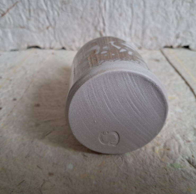A small stoneware bud vase with a copper toadstool image on the surface. Hand thrown on the potter's wheel using 250g of clay, then glazed inside and outside but not on the base. Stoneware clay is fired at very high temperatures and the clay is fully vitrified with the glaze making it completely watertight. The toadstool is an overglaze transfer and is permanent being fired on at 800 degrees Centigrade. Each bud vase measures approximately 10.5cm high, 5.5cm diameter at the base and 1.5cm opening at the top. There may be small variations being individually made. The clay fires a light buff colour. Perfect for holding one or two flower buds or plants.