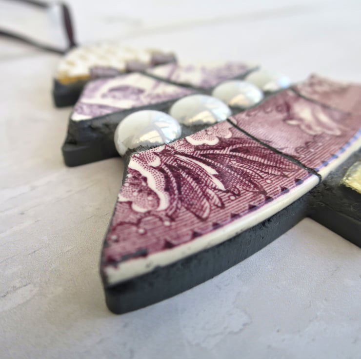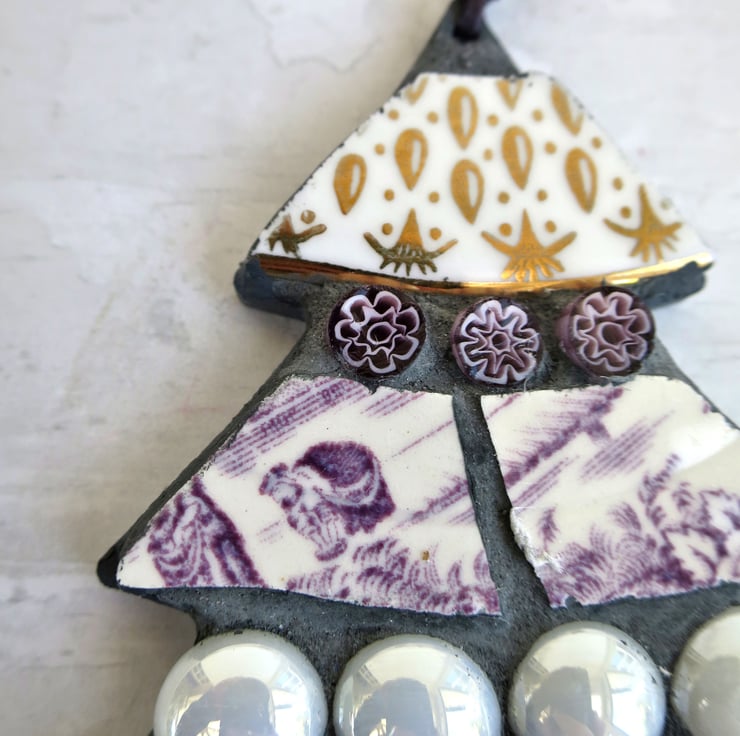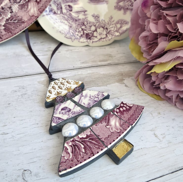Christmas tree shaped mosaic festive ornament, made from purple, white and gold vintage china plates, glass tiles and millefiori glass. This handcrafted pique assiette mosaic will make a original and unique holiday decoration or a special gift for a loved one.