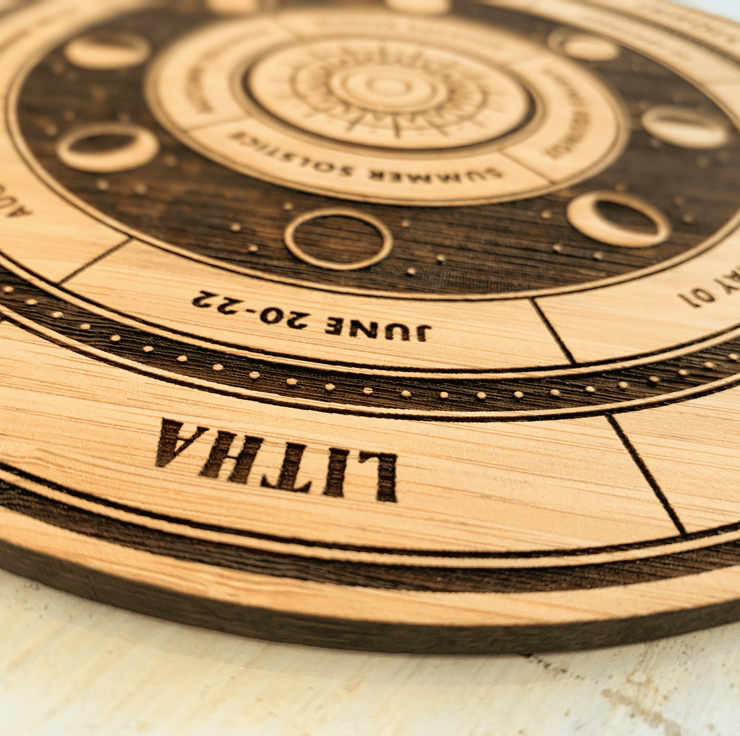 A disc of beautiful bamboo, etched with my Wheel of the Year design. This wheel features the 8 festival names and dates, and the quarterly solar events which link them. It has a sun at the center, and a decorative ring of moon phases in the middle. The wheel measures 207 x 207mm and is 5mm thick. It comes complete with a small stand on which it can be displayed and rotated as the seasons change. The stand is made of 3mm bamboo, and simply slots together.