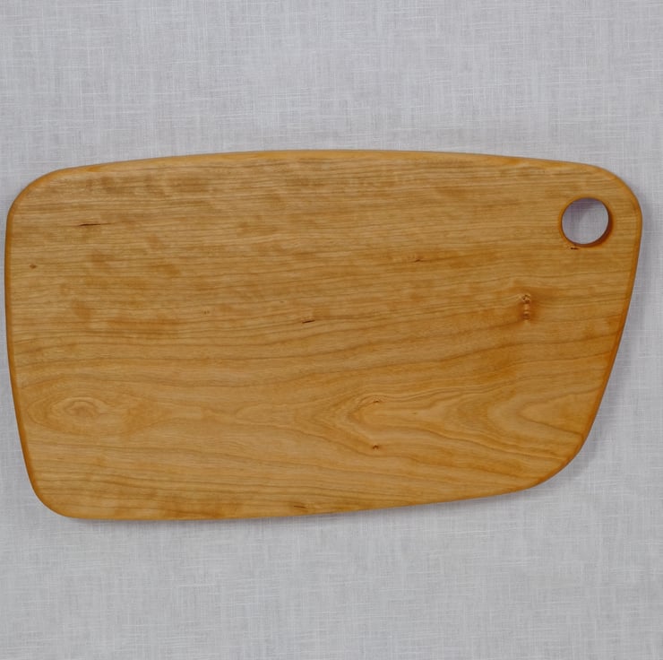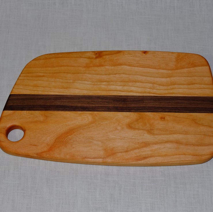 Mid-century style chopping board available in either solid American Black Cherry or American Black Cherry and American Black Walnut. They are given a boiling water treatment to ensure the smooth finish remains after washing and they are finished in a food safe natural Linseed Oil. Sizes are 385mm 225mm and approximately 20mm thick. Due to the natural variations inherent in wood your item may vary from that shown.
