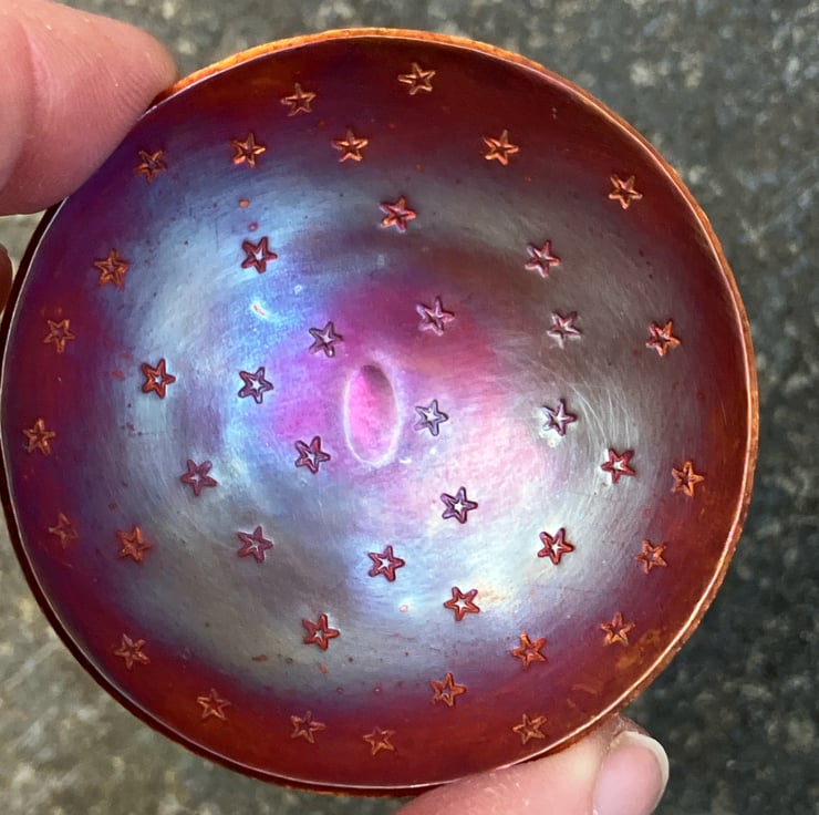 Flame painted copper bowl with stamped star decoration, copper ring dish, copper earring dish, 7th wedding anniversary gift.