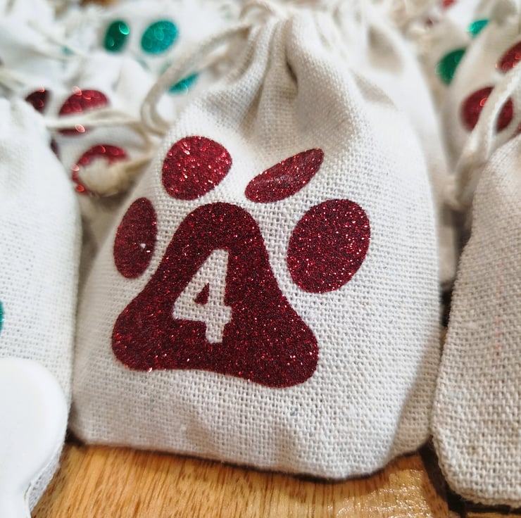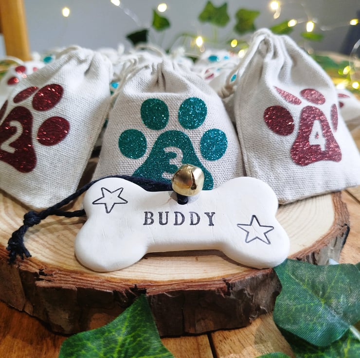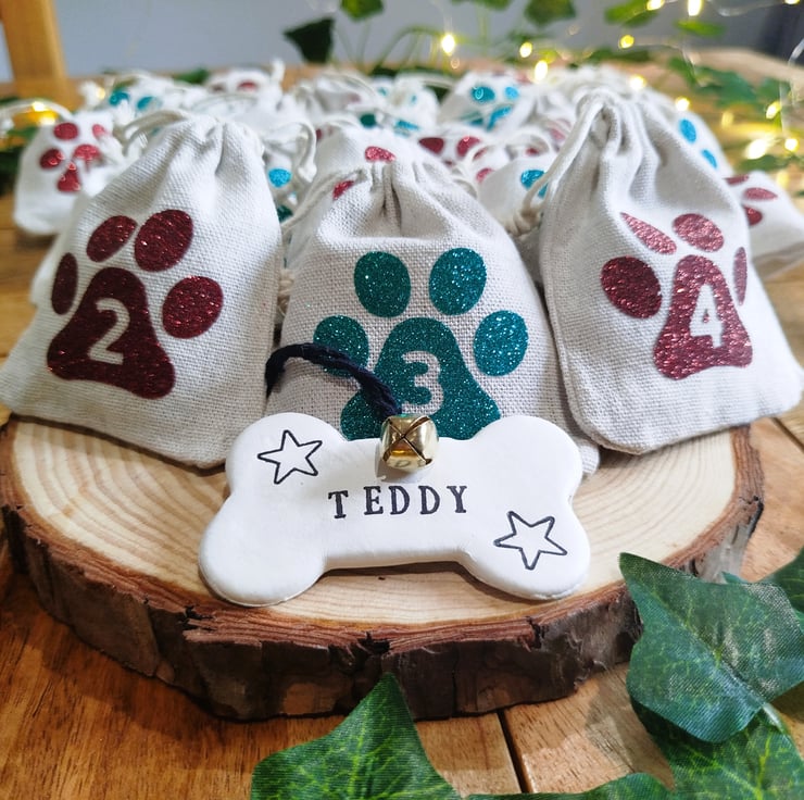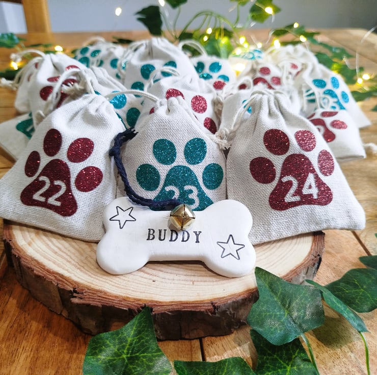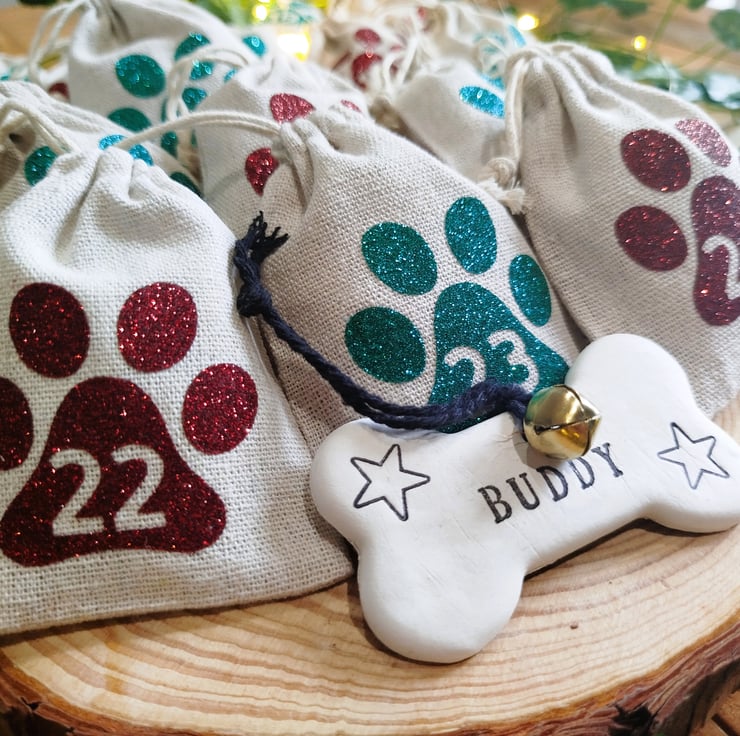 Advent Calendar for Dogs, Treat your furry friend to a tail-wagging holiday season with this adorable set of mini treat sacks plus hand crafted personalised dog bone tree ornament. (treats not included due to differing dietary requirements)