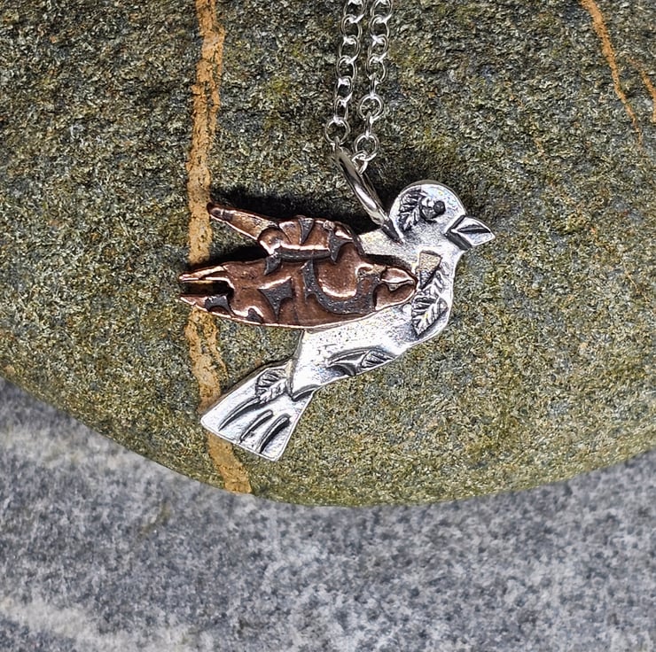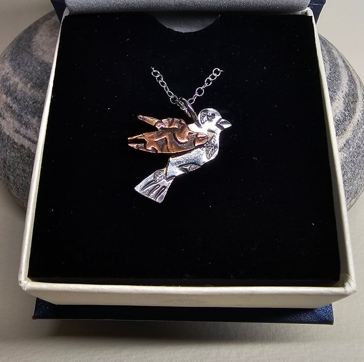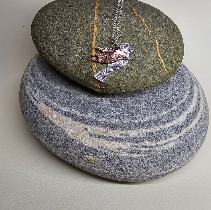 This little fellow is crafted from sterling silver sheet and copper. He has been hand-sawn, textured using metal tools to create unique marks, and patterned by passing the copper through a rolling mill with a texturising plate. It is then made through a lost wax casting process, finished by hand, and oxidised to highlight the intricate details.