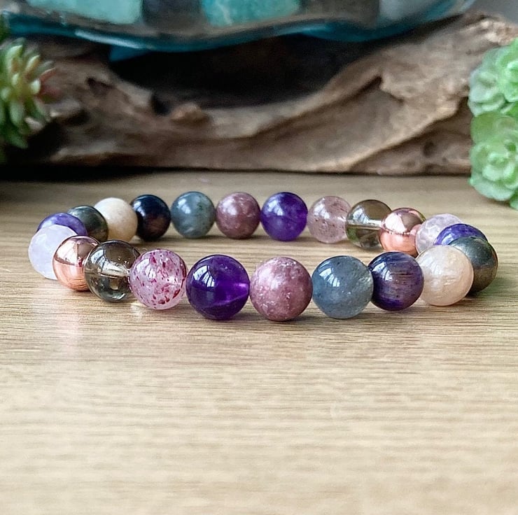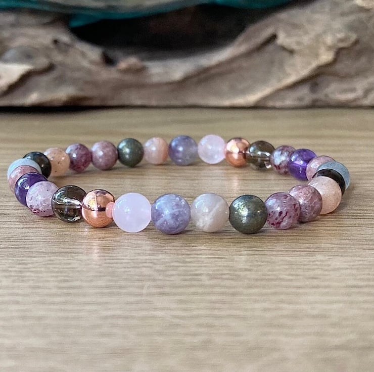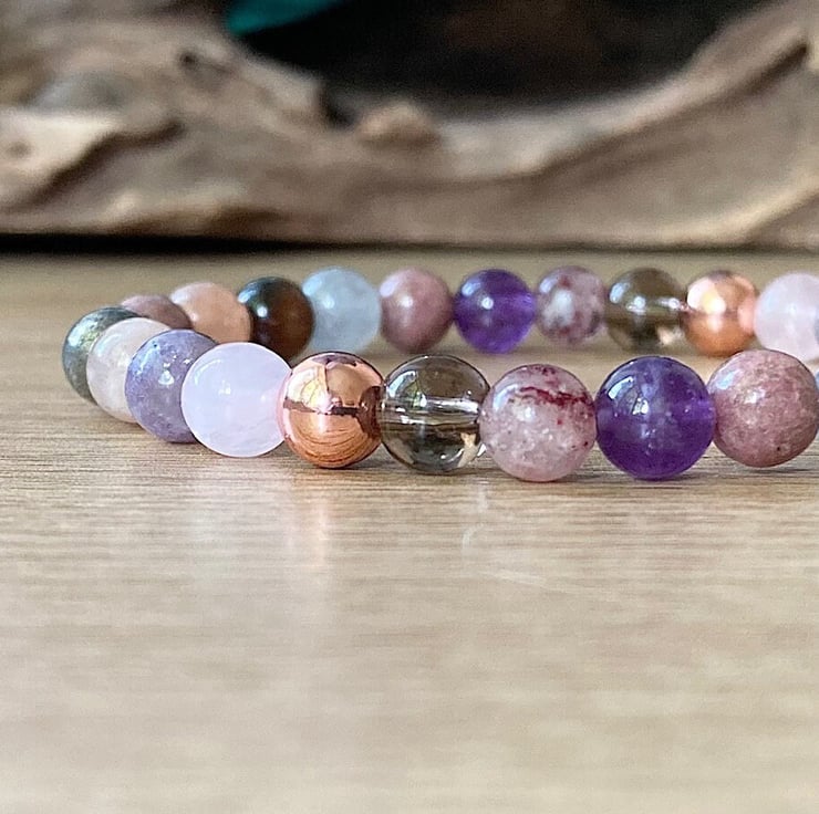 Lepidolite, Smokey Quartz, Pyrite, Labradorite, Amethyst, Rose Quartz, Rhodonite, Strawberry Quartz, Rose Gold Hematite, Sunstone, Tigers Eye