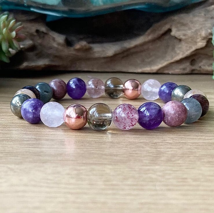 The Empath & Protection bracelet has been created to help support, heal, deflect and shield you from the negative energies from other people. The crystals have been selected so that they flow together perfectly to offer protective energies, balance emotions, assist in letting go of draining emotions, and thoughts, and offer peaceful vibrations.