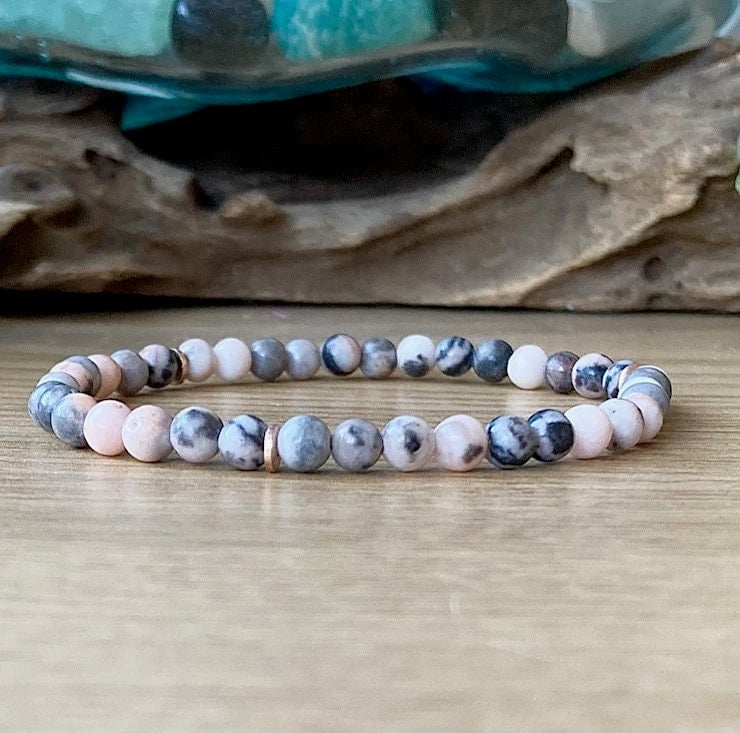 This bracelet is made with genuine AAA Grade 4mm Pink Zebra Jasper gemstones with your choice of gold, silver or rose gold spacers.