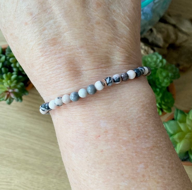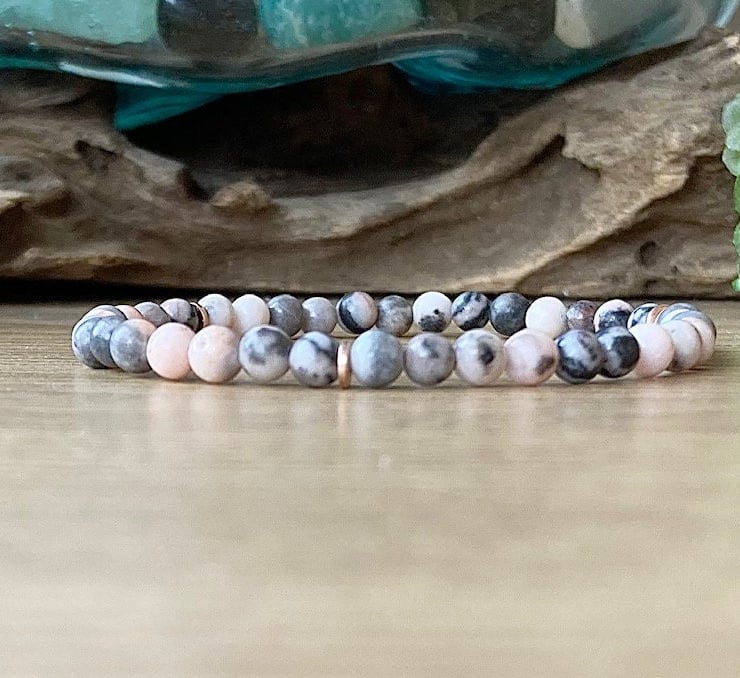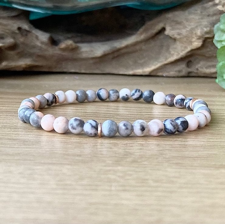 This bracelet is made with genuine AAA Grade 4mm Pink Zebra Jasper gemstones with your choice of gold, silver or rose gold spacers.
