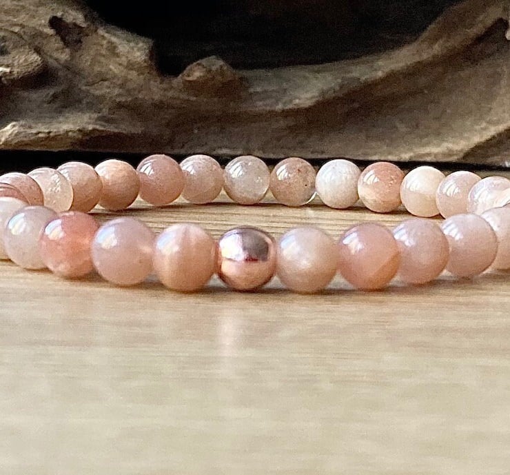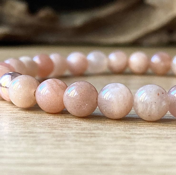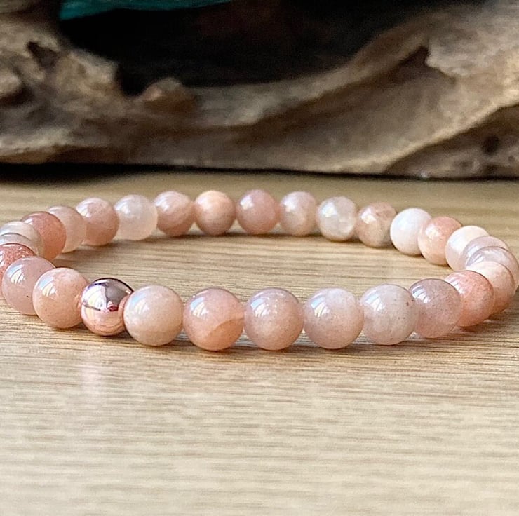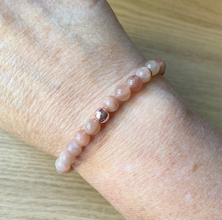 Genuine Sunstone high quality stretch bracelet made with either 6mm or 8mm smooth round gemstones and a copper hematite bead. It is strung on non-fray, latex-free, stretch cording, and the knot is fused and hidden.