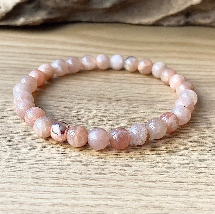 Genuine Sunstone high quality stretch bracelet made with either 6mm or 8mm smooth round gemstones and a copper hematite bead. It is strung on non-fray, latex-free, stretch cording, and the knot is fused and hidden.
