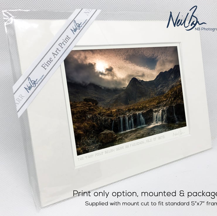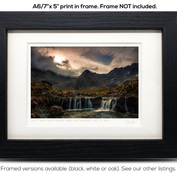 Supplied already mounted, wrapped & with signed labels & certificate, the image is printed on A6 size fine art paper (148x105mm). The actual image size is smaller (see listing images for sizes - image approx. 115x77mm) to allow for the signature & inscription. The 100% acid-free mount is cut to fit standard ready-made frames from high street stores. EXTERNAL mount size is 7"x5". This is the OUTSIDE size of the mount (and thus the size your frame should be).