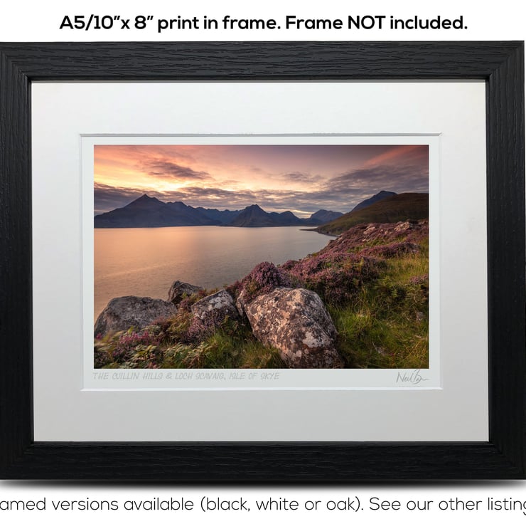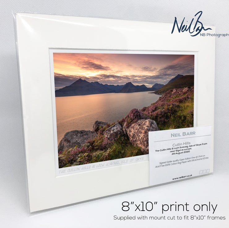 Supplied already mounted, wrapped & with signed labels & certificate, the image is printed on A5 size fine art paper (148x210mm). The actual image size is smaller (see listing images for sizes - image approx. 185x123mm) to allow for the signature & inscription. The 100% acid-free mount is cut to fit standard ready-made frames from high street stores. EXTERNAL mount size is 10"x8". This is the OUTSIDE size of the mount (and thus the size your frame should be).