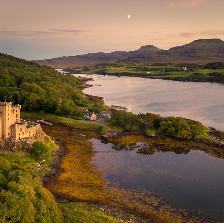 Image: "Dunvegan Castle" - Dunvegan Castle on the Isle of Skye & Loch Dunvegan, looking towards Macleod's Tables at sunset, 26 August 2020 - by Scotland photographer Neil Barr
