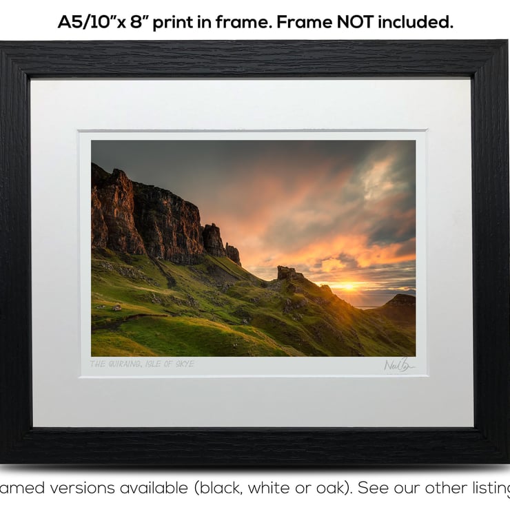 Supplied already mounted, wrapped & with signed labels & certificate, the image is printed on A5 size fine art paper (148x210mm). The actual image size is smaller (see listing images for sizes - image approx. 185x123mm) to allow for the signature & inscription. The 100% acid-free mount is cut to fit standard ready-made frames from high street stores. EXTERNAL mount size is 10"x8". This is the OUTSIDE size of the mount (and thus the size your frame should be).