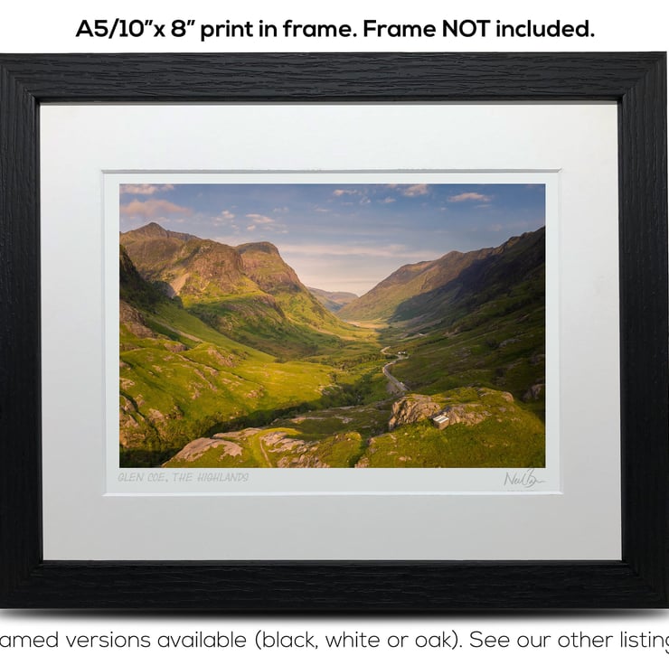 Supplied already mounted, wrapped & with signed labels & certificate, the image is printed on A5 size fine art paper (148x210mm). The actual image size is smaller (see listing images for sizes - image approx. 185x123mm) to allow for the signature & inscription. The 100% acid-free mount is cut to fit standard ready-made frames from high street stores. EXTERNAL mount size is 10"x8". This is the OUTSIDE size of the mount (and thus the size your frame should be).