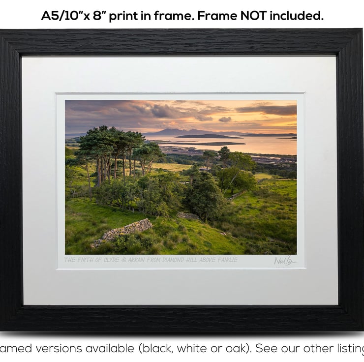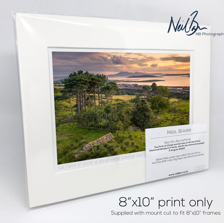 Supplied already mounted, wrapped & with signed labels & certificate, the image is printed on A5 size fine art paper (148x210mm). The actual image size is smaller (see listing images for sizes - image approx. 185x123mm) to allow for the signature & inscription. The 100% acid-free mount is cut to fit standard ready-made frames from high street stores. EXTERNAL mount size is 10"x8". This is the OUTSIDE size of the mount (and thus the size your frame should be).