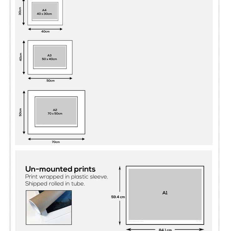See menu (Shop collections) for different sizes & framed/unframed options. Images are organised by size & unframed or framed. Images are available in all sizes (except panoramas) from A6 to A2. See menu (Shop collections) for different options. Frames are available for delivery up to the A3 size paper in Black, White or Oak.