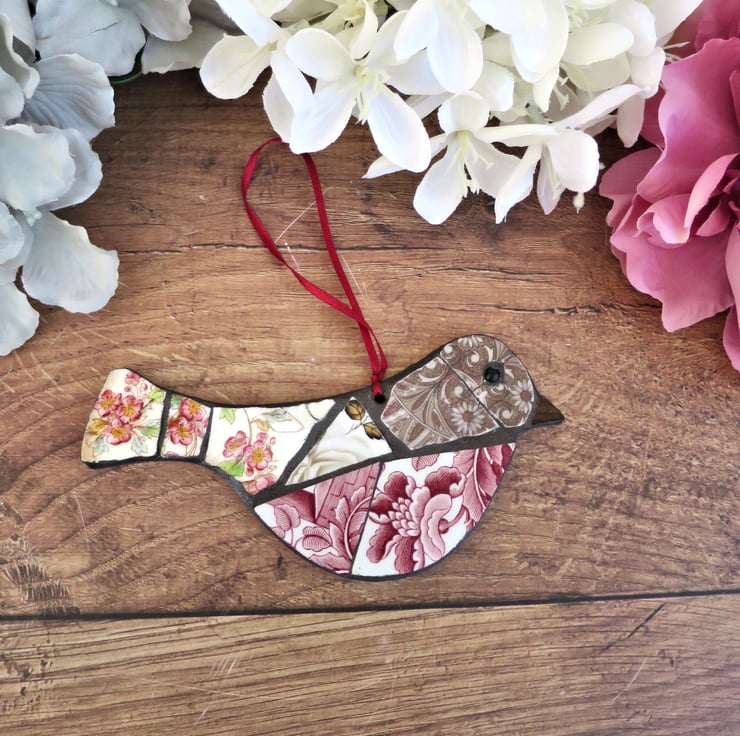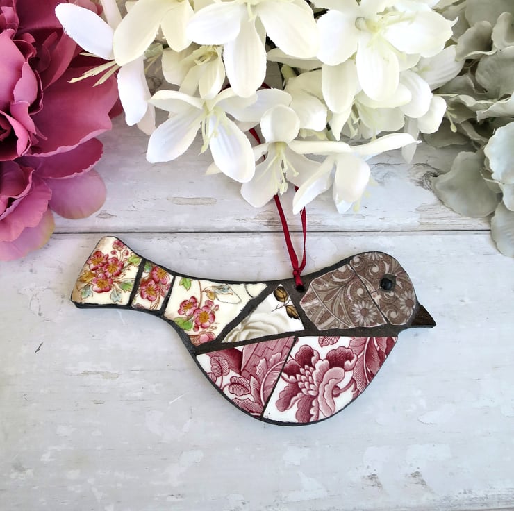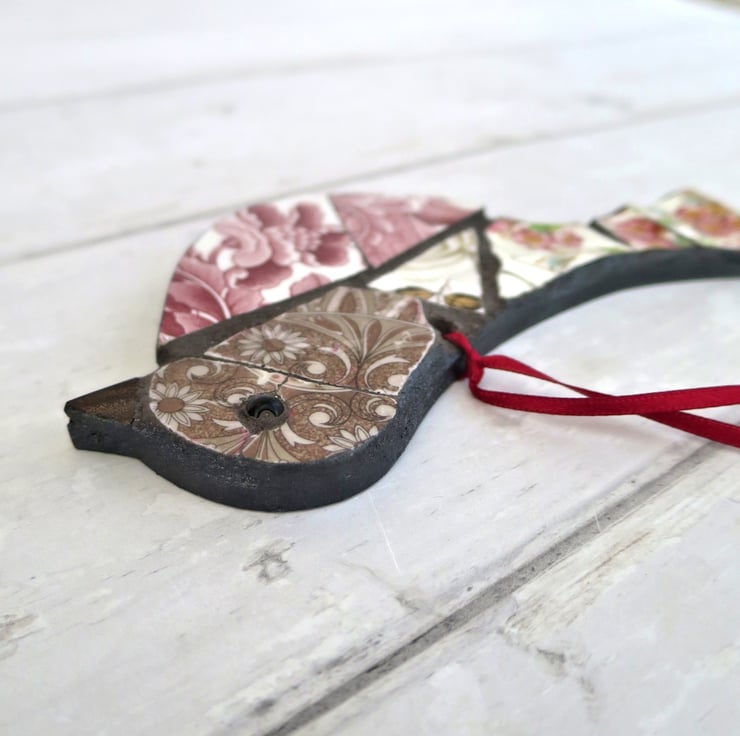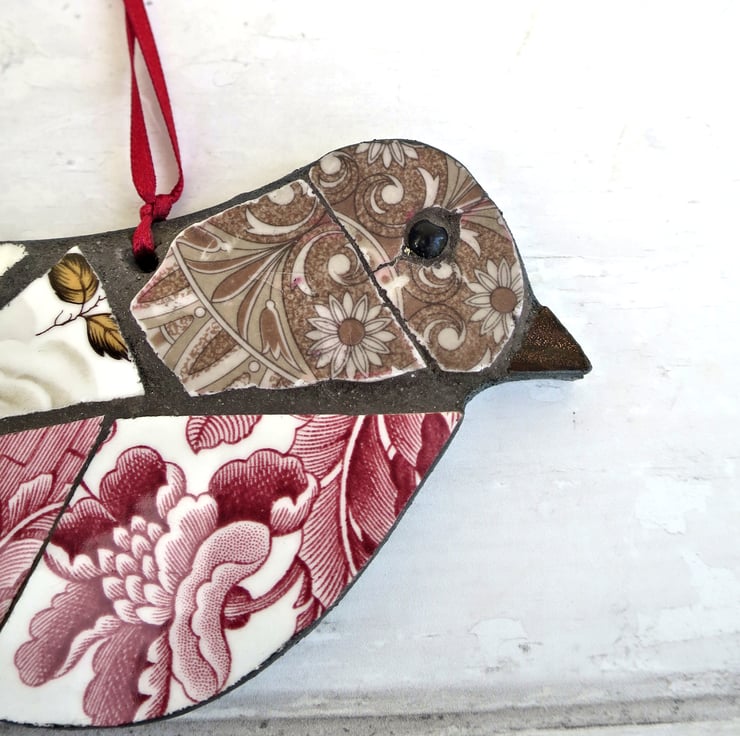 Vintage Mosaic Robin, Handmade Bird Wall Decoration with Recycled China