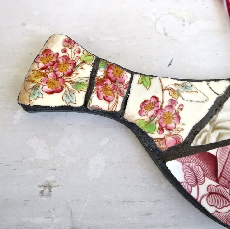 This mosaic robin is handmade from upcycled vintage china, including Hawthorn Sprigs pattern. Carefully shaped on a sturdy MDF base, each bird is completely unique — a one-of-a-kind treasure made from timeworn fragments, now lovingly repurposed.