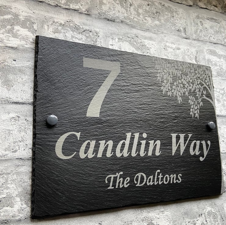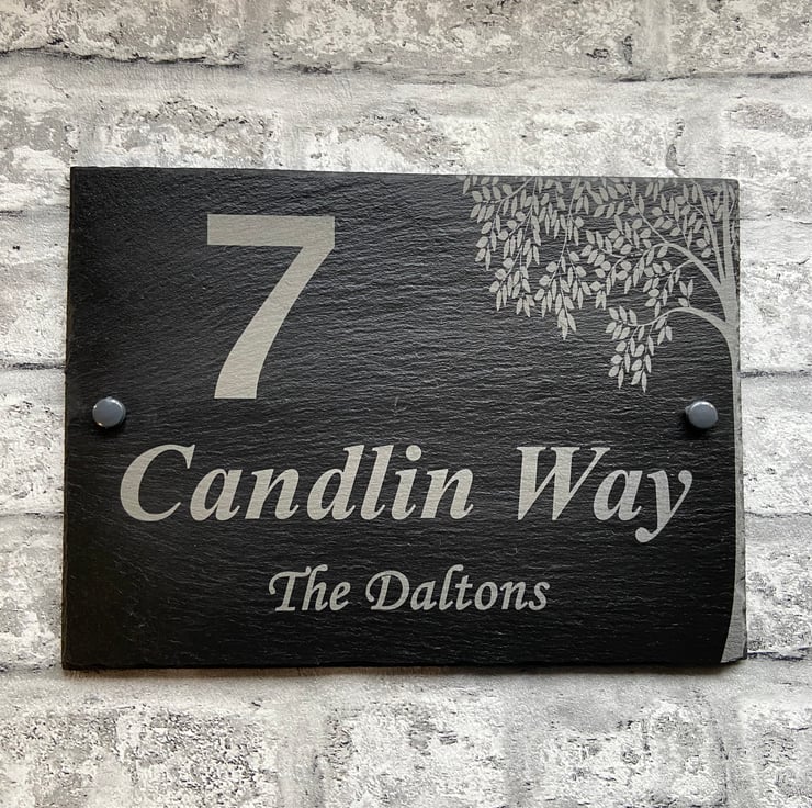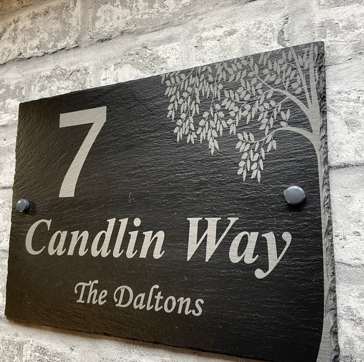 Add a touch of elegance to your home with our personalised slate house sign. It is permanently laser engraved with your chosen address and family Name (optional) making it the perfect one of a kind sign for your home or a ideal unique gift. The tree image will automatically be engraved.