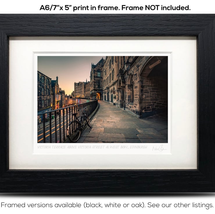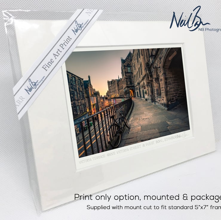 Supplied already mounted, wrapped & with signed labels & certificate, the image is printed on A6 size fine art paper (148x105mm). The actual image size is smaller (see listing images for sizes - image approx. 115x77mm) to allow for the signature & inscription. The 100% acid-free mount is cut to fit standard ready-made frames from high street stores. EXTERNAL mount size is 7"x5". This is the OUTSIDE size of the mount (and thus the size your frame should be).