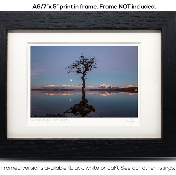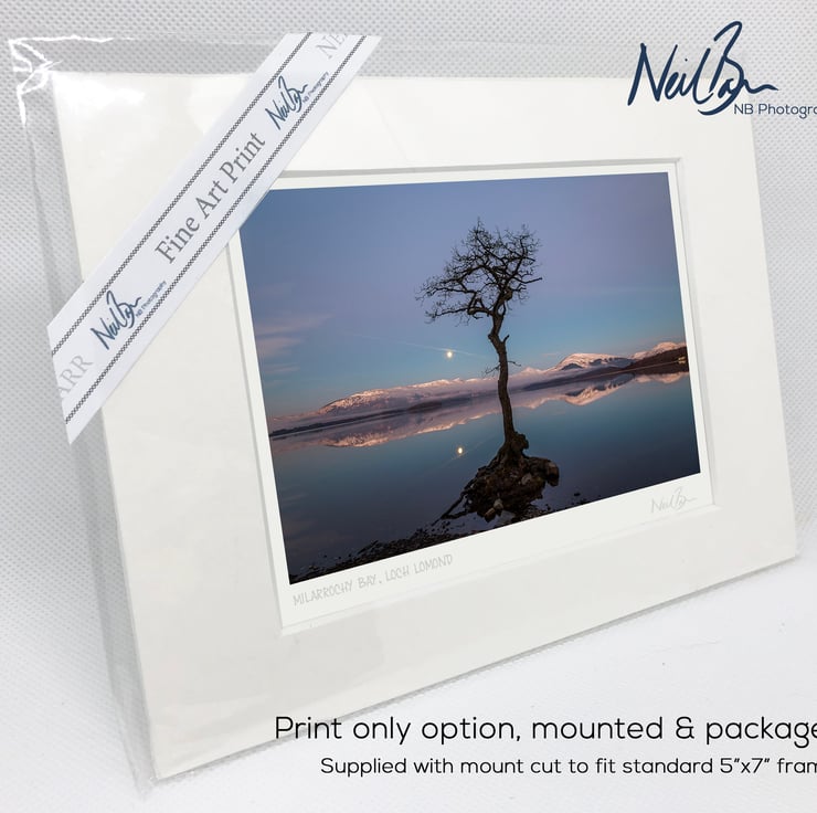 Supplied already mounted, wrapped & with signed labels & certificate, the image is printed on A6 size fine art paper (148x105mm). The actual image size is smaller (see listing images for sizes - image approx. 115x77mm) to allow for the signature & inscription. The 100% acid-free mount is cut to fit standard ready-made frames from high street stores. EXTERNAL mount size is 7"x5". This is the OUTSIDE size of the mount (and thus the size your frame should be).
