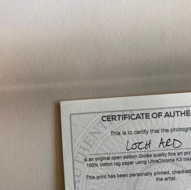 Open edition Giclee photographic print on 100% cotton rag smooth matt fine art paper with UltraChrome K3 Inks. The smooth surface & soft velvet feel give the print an almost painterly quality. As the paper does not use any optical brighteners, the image is guaranteed to be lightfast for 100yrs in normal viewing conditions.