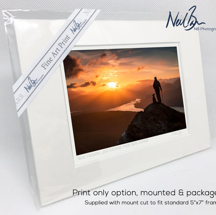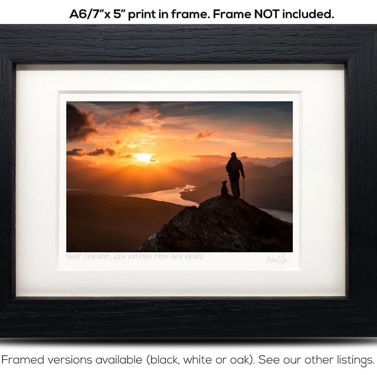Supplied already mounted, wrapped & with signed labels & certificate, the image is printed on A6 size fine art paper (148x105mm). The actual image size is smaller (see listing images for sizes - image approx. 115x77mm) to allow for the signature & inscription. The 100% acid-free mount is cut to fit standard ready-made frames from high street stores. EXTERNAL mount size is 7"x5". This is the OUTSIDE size of the mount (and thus the size your frame should be).