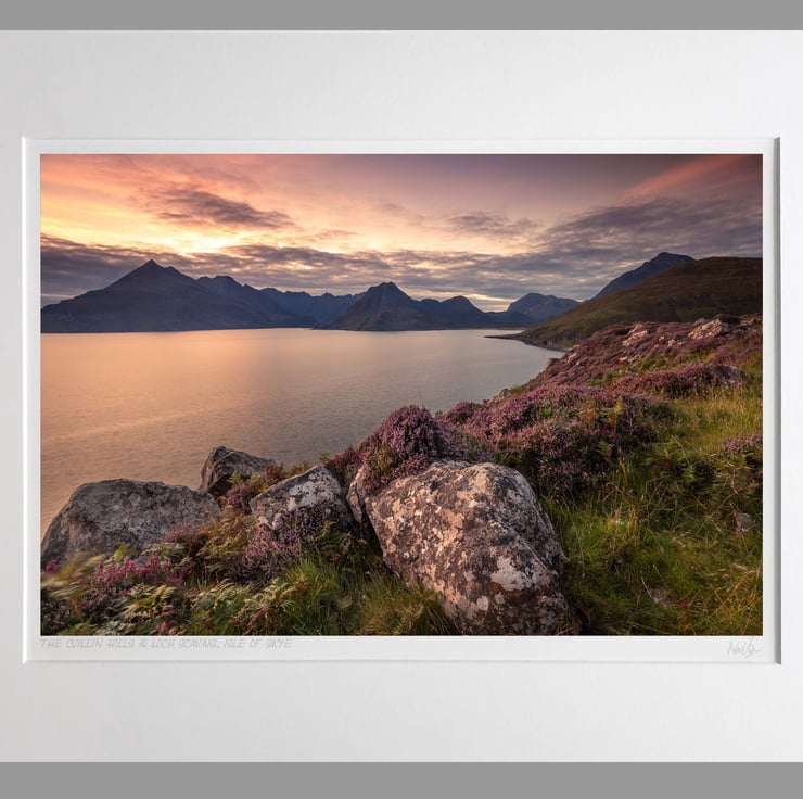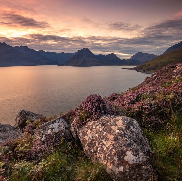 Image: "Cullin Hills" - The Cuillin Hills & Loch Scavaig, Isle of Skye from near Elgol at sunset, 29 August 2020 - by Scotland photographer Neil Barr