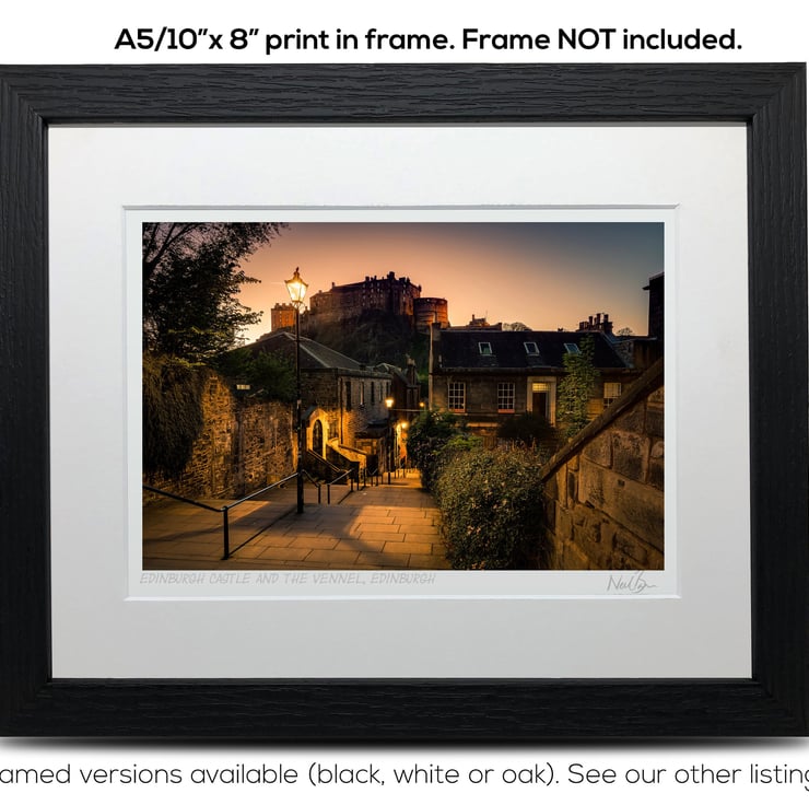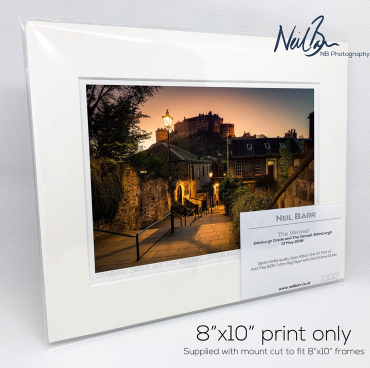 Supplied already mounted, wrapped & with signed labels & certificate, the image is printed on A5 size fine art paper (148x210mm). The actual image size is smaller (see listing images for sizes - image approx. 185x123mm) to allow for the signature & inscription. The 100% acid-free mount is cut to fit standard ready-made frames from high street stores. EXTERNAL mount size is 10"x8". This is the OUTSIDE size of the mount (and thus the size your frame should be).