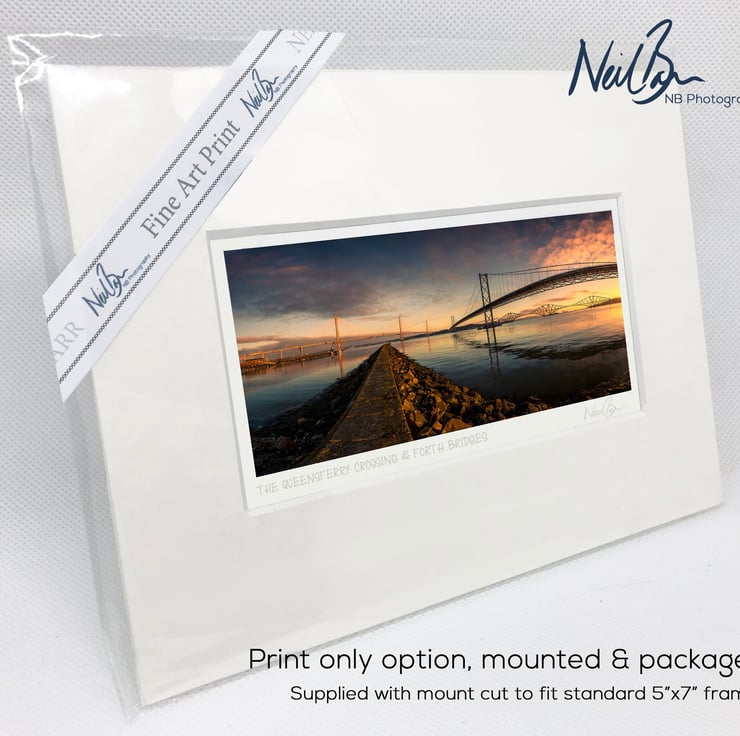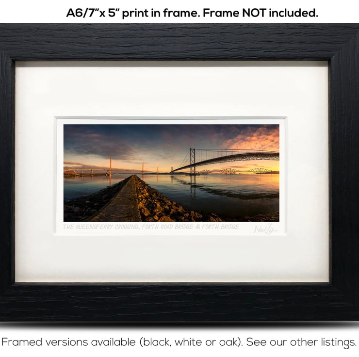 Supplied already mounted, wrapped & with signed labels & certificate, the image is printed on A6 size fine art paper (148x105mm). The actual image size is smaller (see listing images for sizes - image approx. 115x52mm) to allow for the signature & inscription. The 100% acid-free mount is cut to fit standard ready-made frames from high street stores. EXTERNAL mount size is 7"x5". This is the OUTSIDE size of the mount (and thus the size your frame should be).