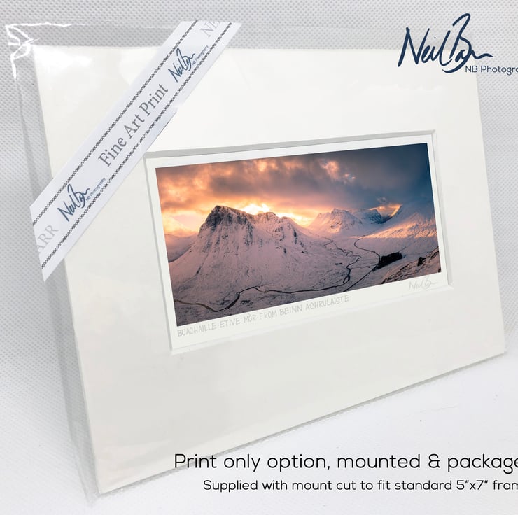 Supplied already mounted, wrapped & with signed labels & certificate, the image is printed on A6 size fine art paper (148x105mm). The actual image size is smaller (see listing images for sizes - image approx. 115x50mm) to allow for the signature & inscription. The 100% acid-free mount is cut to fit standard ready-made frames from high street stores. EXTERNAL mount size is 7"x5". This is the OUTSIDE size of the mount (and thus the size your frame should be).