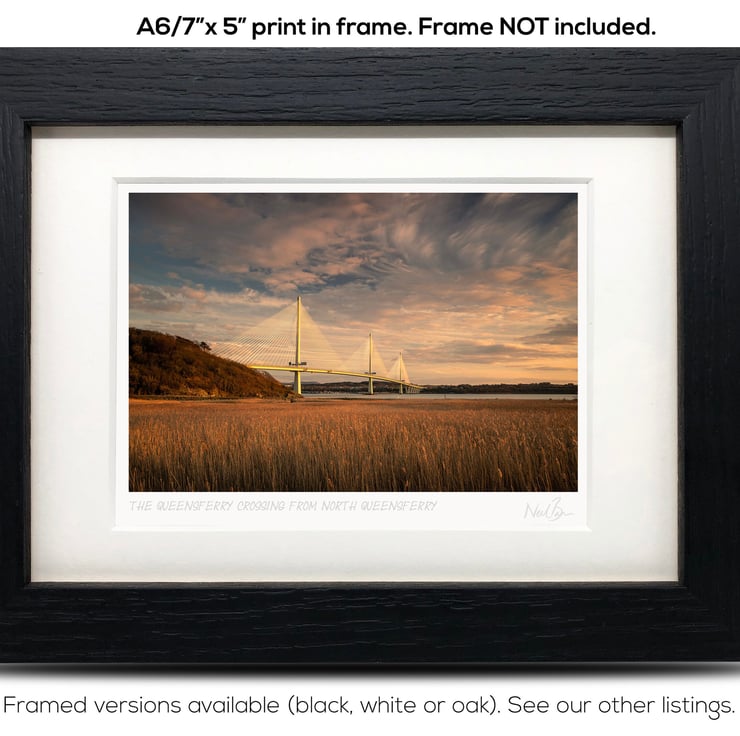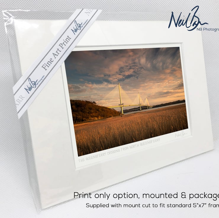 Supplied already mounted, wrapped & with signed labels & certificate, the image is printed on A6 size fine art paper (148x105mm). The actual image size is smaller (see listing images for sizes - image approx. 115x77mm) to allow for the signature & inscription. The 100% acid-free mount is cut to fit standard ready-made frames from high street stores. EXTERNAL mount size is 7"x5". This is the OUTSIDE size of the mount (and thus the size your frame should be).