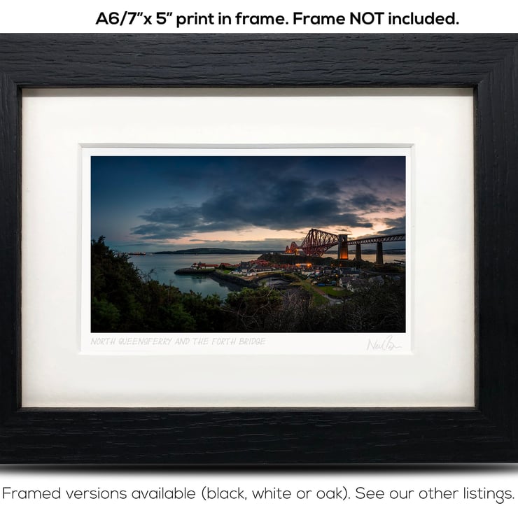 Supplied already mounted, wrapped & with signed labels & certificate, the image is printed on A6 size fine art paper (148x105mm). The actual image size is smaller (see listing images for sizes - image approx. 115x65mm) to allow for the signature & inscription. The 100% acid-free mount is cut to fit standard ready-made frames from high street stores. EXTERNAL mount size is 7"x5". This is the OUTSIDE size of the mount (and thus the size your frame should be).
