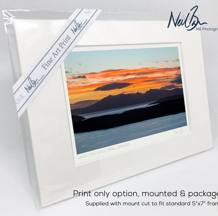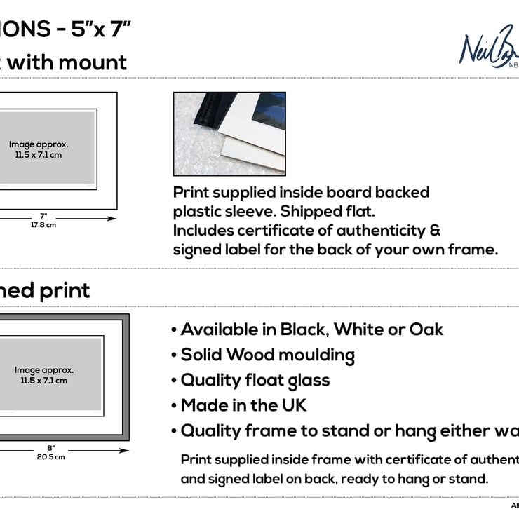 Supplied already mounted, wrapped & with signed labels & certificate, the image is printed on A6 size fine art paper (148x105mm). The actual image size is smaller (see listing images for sizes - image approx. 115x71mm) to allow for the signature & inscription. The 100% acid-free mount is cut to fit standard ready-made frames from high street stores. EXTERNAL mount size is 7"x5". This is the OUTSIDE size of the mount (and thus the size your frame should be).